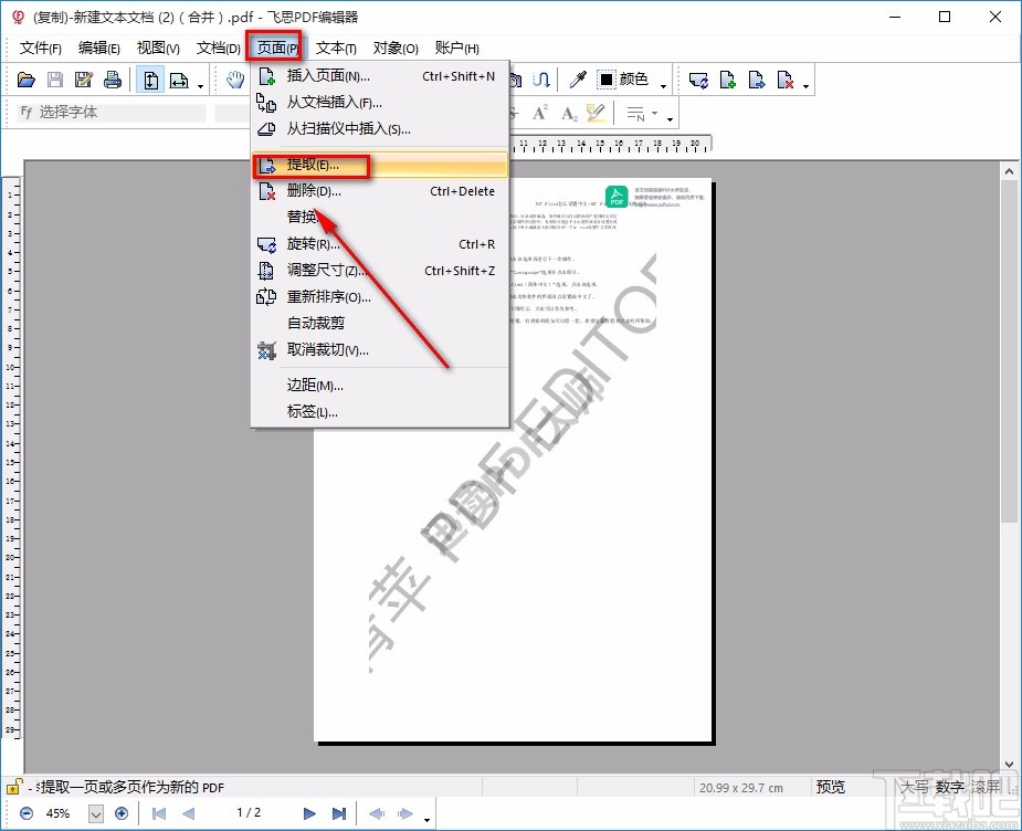 3.将文件添加到软件后,我们在界面上方点击“页面”选项,其下方就会出现一个下拉框,在下拉框中选择“提取”选项。