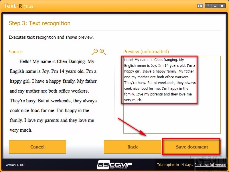 6.接下来软件就会开始识别图片文字,识别结果会显示在界面右侧,我们点击界面右下角的“Save document”按钮即可。