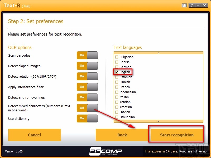 5.随后就会看到下图所示的界面,我们根据自己的需要在界面右侧勾选图片上的文字语言类型,并在界面左侧根据自己的需要打开文字识别的操作选项,再点击页面右下角的“Start recognition”按钮。