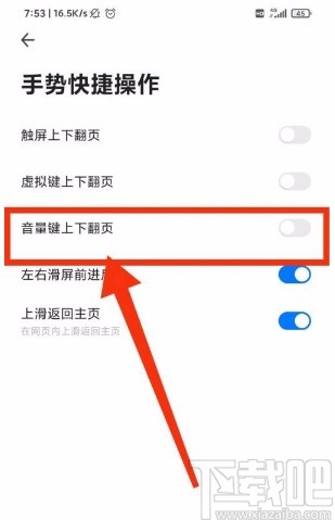 5.最后就会看到下图所示的界面,我们在界面上找到“音量键上下翻页”选项,其后面有一个开关按钮,点击该按钮将其打开,即可完成全部的操作步骤。
