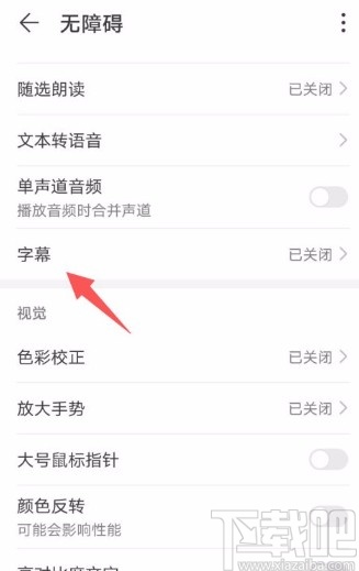 4.接下来就会跳转到无障碍页面,我们在页面上找到“字幕”选项,点击这个选项就可以了,如下图所示。