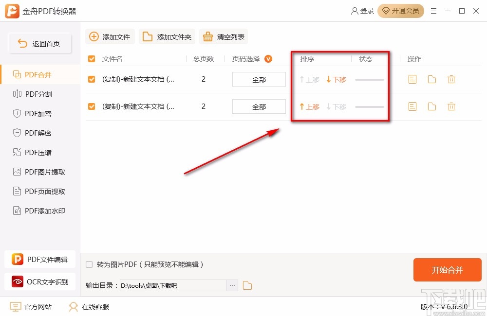4.将文件添加到软件后,我们在界面上可以找到“排序”一栏,在该栏后面点击“上移”、“下移”按钮,就可以调整PDF合并的顺序。