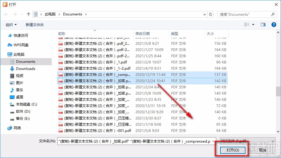 3.然后就会进入到文件添加页面,我们在页面中选中需要进行合并操作的PDF文件,再点击页面右下角的“打开”按钮就可以了。
