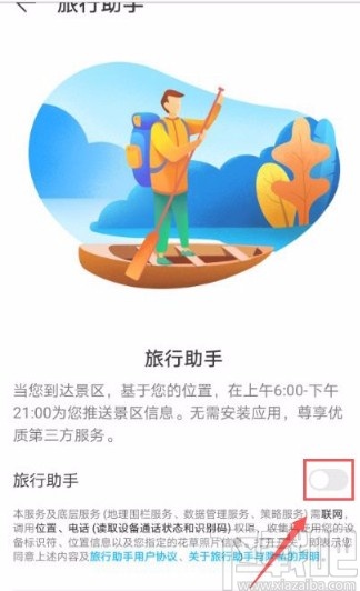 3.然后就会进入到旅行助手页面,我们在页面上找到“旅行助手”选项,其后面有一个开关按钮。