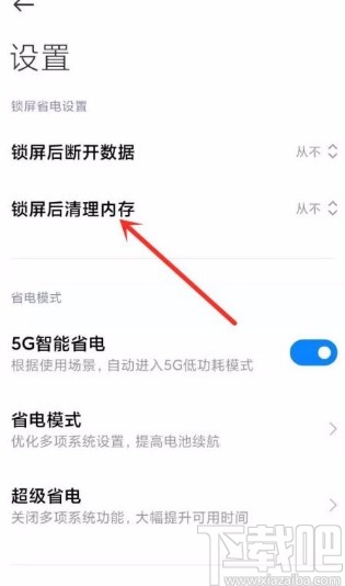 4.接下来就会进入设置页面,我们在页面上找到“锁屏后清理内存”选项,点击这个选项就可以了。