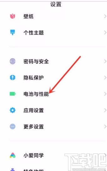 3.接着在设置页面中,我们在页面下方找到“电池与性能”选项,点击这个选项就能切换到电池与性能页面。