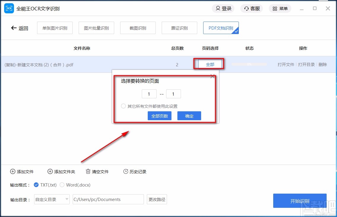 4.将文件添加到软件后,我们在界面上方找到“页码选择”选项,点击该选项下方的“全部”按钮打开页面选择窗口,在窗口中设置好需要识别的页面,并点击窗口右下角的“确定”按钮就可以了。