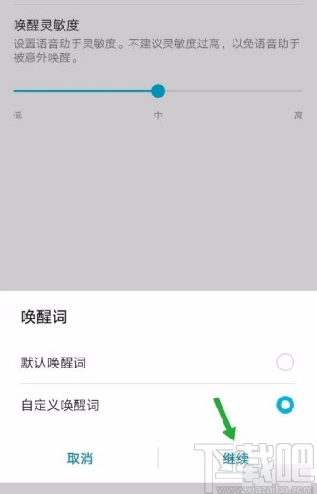 4.接下来在界面下方就会出现一个唤醒词窗口,我们在窗口中选择“自定义唤醒词”,再点击窗口右下角的“继续”按钮就可以了。