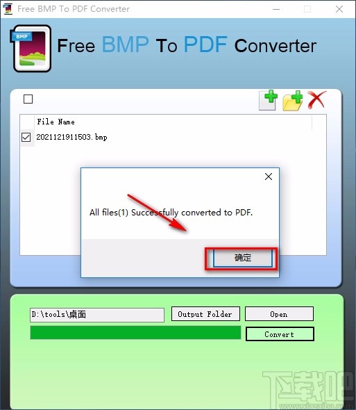 6.文件格式转换完毕后,界面上会出现一个转换成功的提示窗口,如下图所示;我们点击窗口右下角的“确定”按钮,即可成功将BMP图片转为PDF文档了。