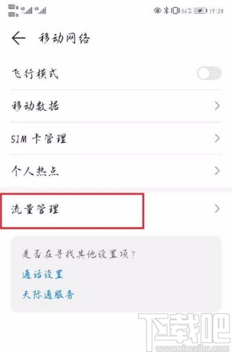 2.进入到移动网络页面后,我们在页面上找到“流量管理”选项,点击这个选项就可以进行下一步操作。