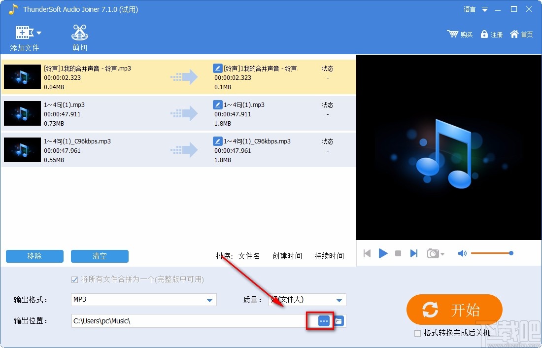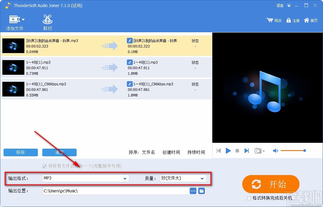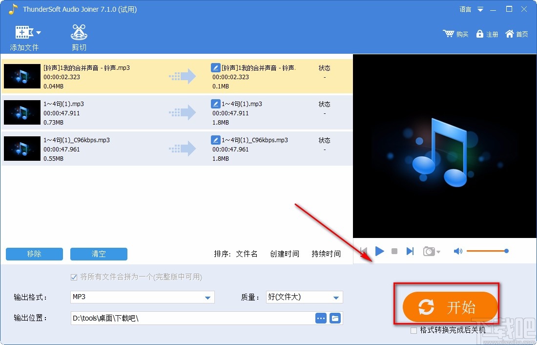 8.随后在界面右下角找到黄色的“开始”按钮,点击该按钮就可以开始合并音频文件了。