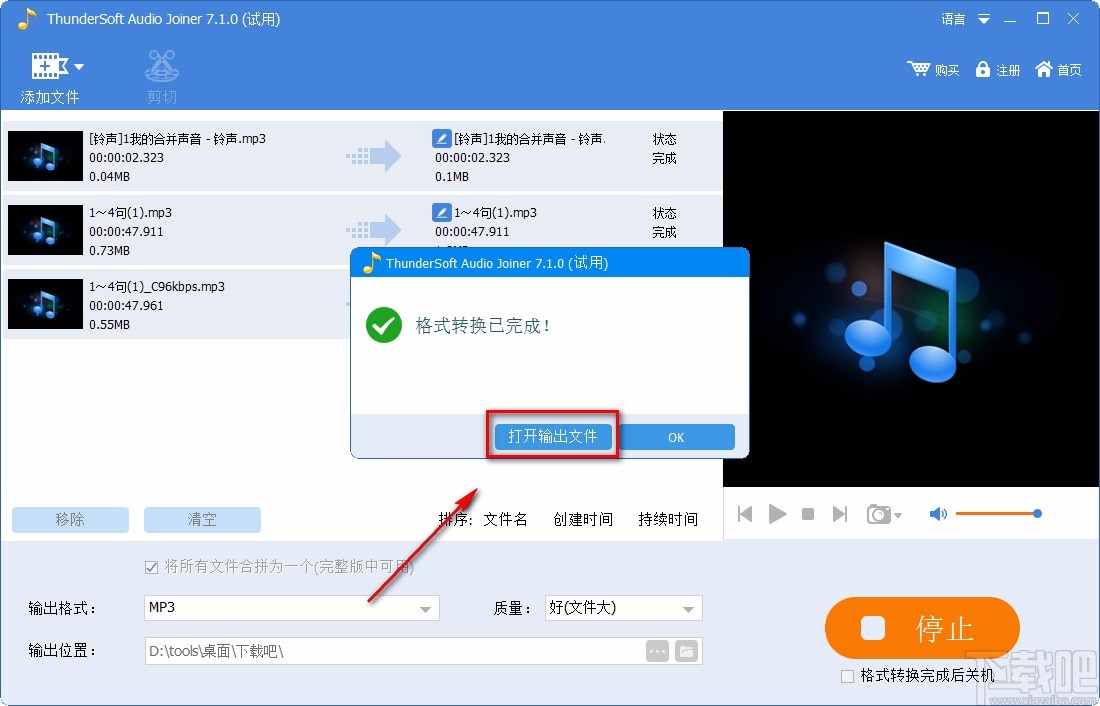 9.音频文件合并成功后,界面上会出现一个窗口,我们直接点击窗口底部的“打开输出文件”按钮,就可以查看合并后的音频文件。