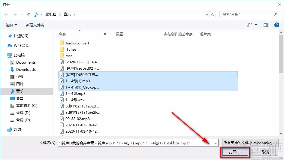 3.在文件添加页面中,我们将需要进行合并操作的音频文件选中,再点击页面右下角的“打开”按钮就可以了。