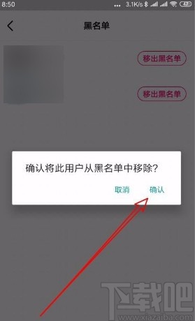 6.最后界面上就会出现一个窗口,我们直接点击窗口中的“确认”按钮,就可以成功将用户移出黑名单了。