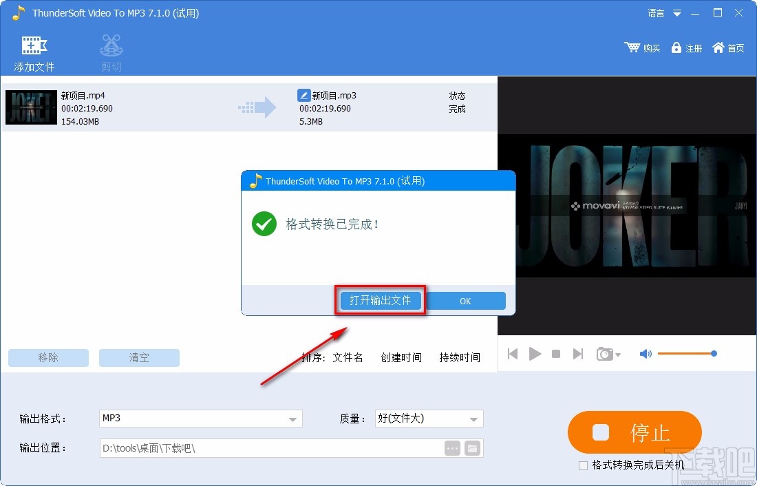 8.格式转换完毕后,界面上会出现一个提示窗口,我们直接点击窗口底部的“打开输出文件”按钮,就可以查看转换后的音频文件。