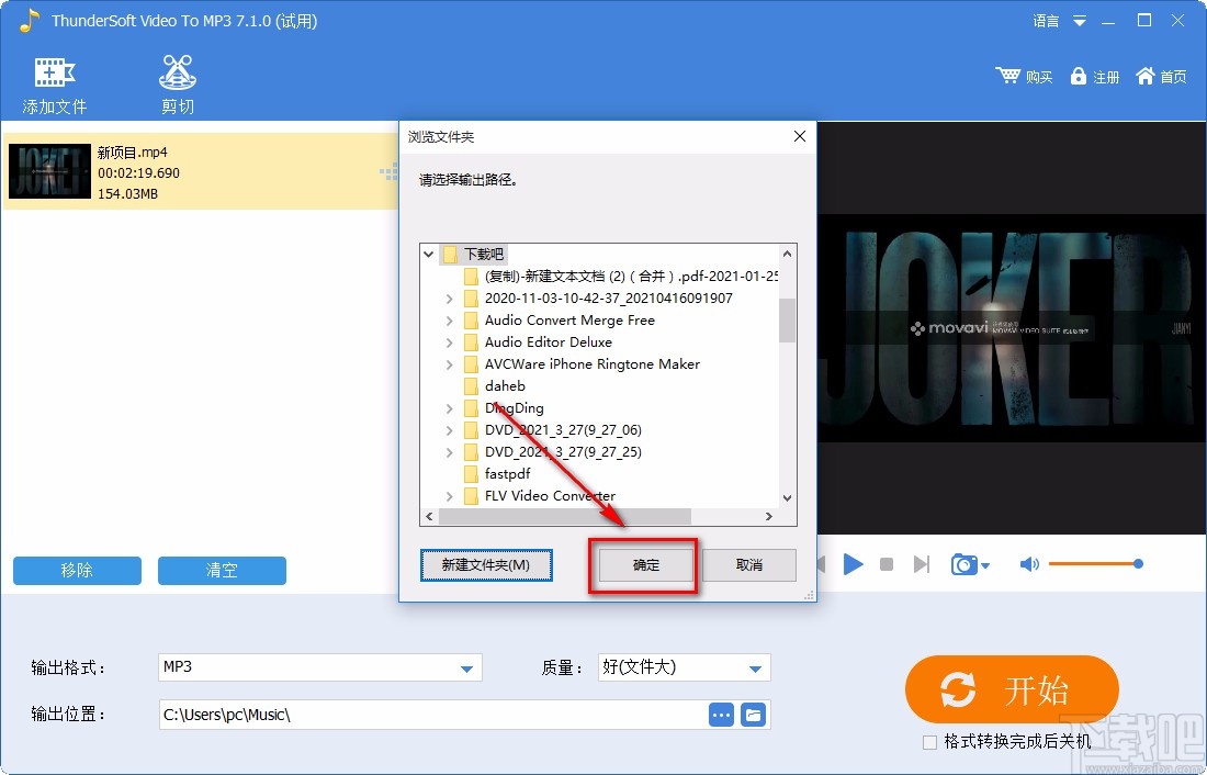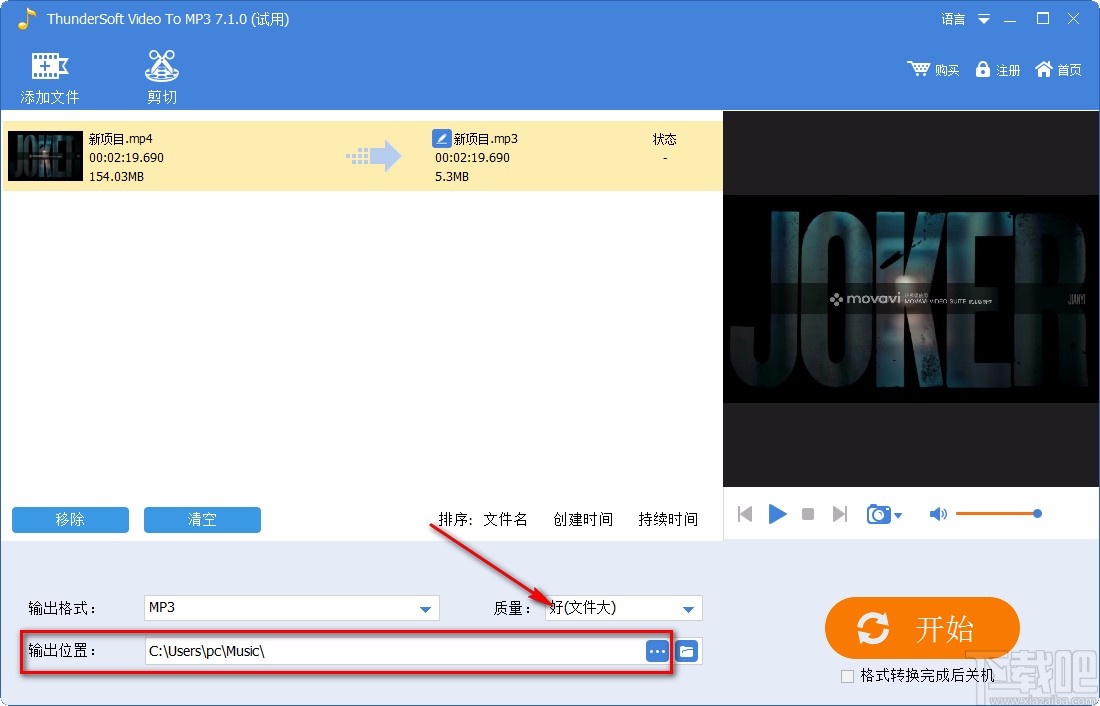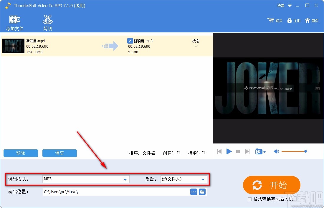 7.完成以上所有步骤后,我们在界面右下角找到“开始”按钮,点击这个按钮就可以开始将视频转为音频了。