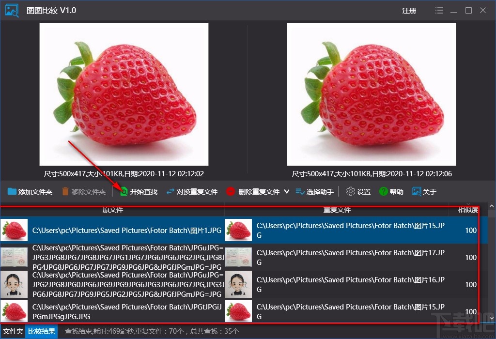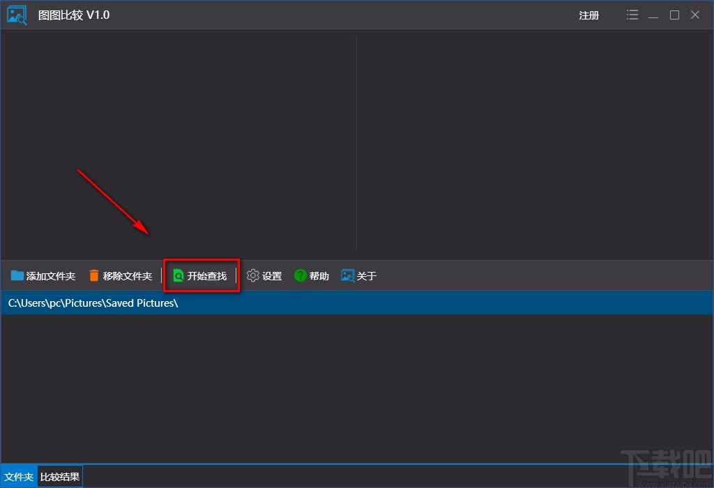 3.将文件夹添加到软件后,我们在界面上找到“开始查找”按钮,点击这个按钮就可以开始查找文件夹中的重复图片。