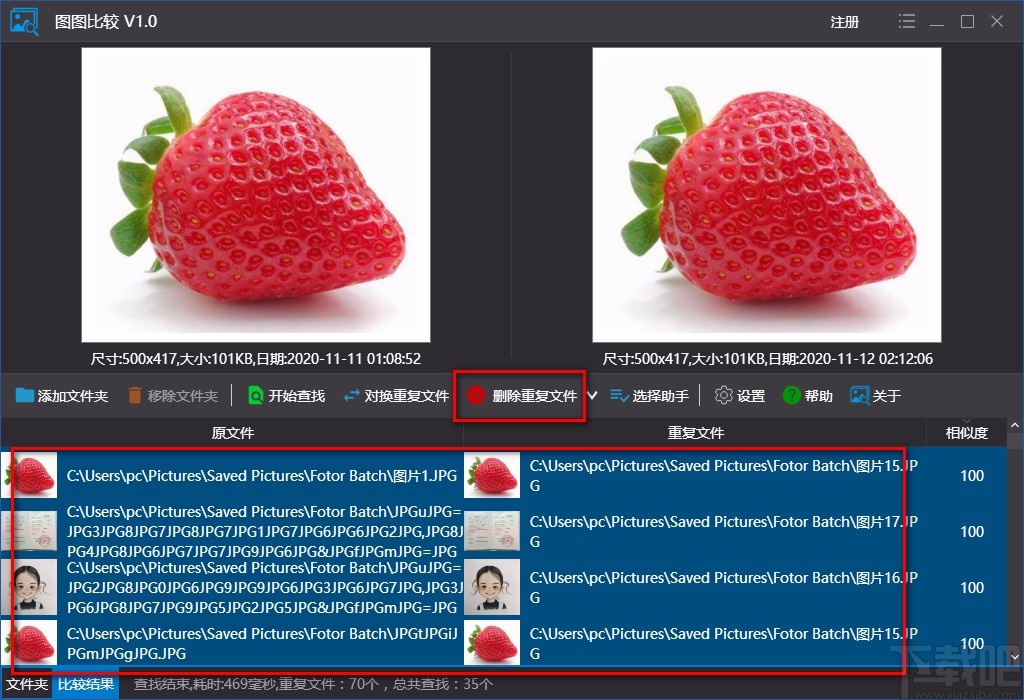 5.接下来在界面下方将需要删除的重复图片选中,并点击“删除重复文件”按钮就可以开始删除图片了。