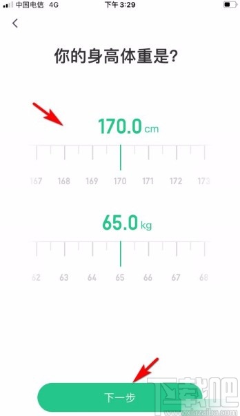 4.接下来就会进入到“你的身高体制是”页面,我们在页面上滑动绿色的竖线,就可以设置自己的身高和体重;之后再点击“下一步”按钮就可以了。
