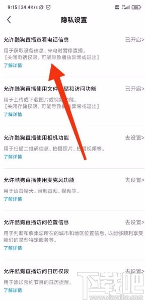 4.接下来就会进入到隐私设置页面,我们在页面上方找到“允许酷狗直播查看电话信息”选项,点击该选项即可。