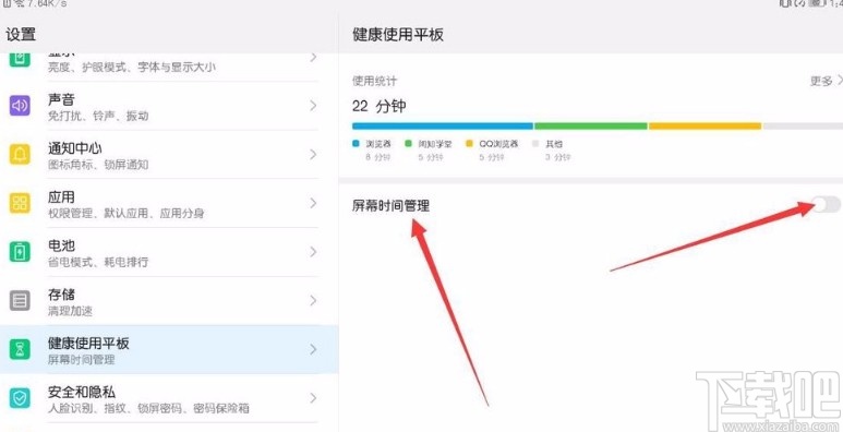 3.然后就会切换到健康使用平板页面,我们在页面上找到“屏幕时间管理”选项,点击该选项后面的开关按钮将其打开。