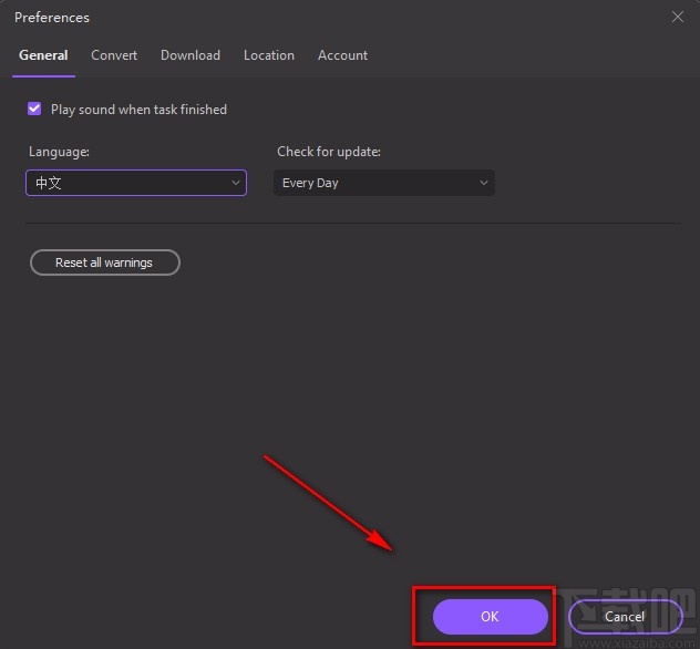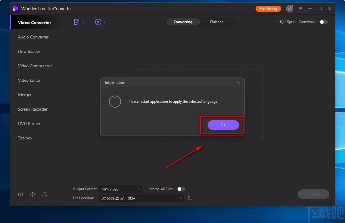 6.完成以上步骤后,界面上就会出现一个窗口,窗口提示我们需要重启软件才能使语言设置生效,我们在窗口右下角找到“OK”按钮并点击就可以了。