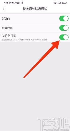 4.接下来就会切换到下图所示的界面,我们在界面上方找到“夜间免打扰”选项,其后面有一个开关按钮。