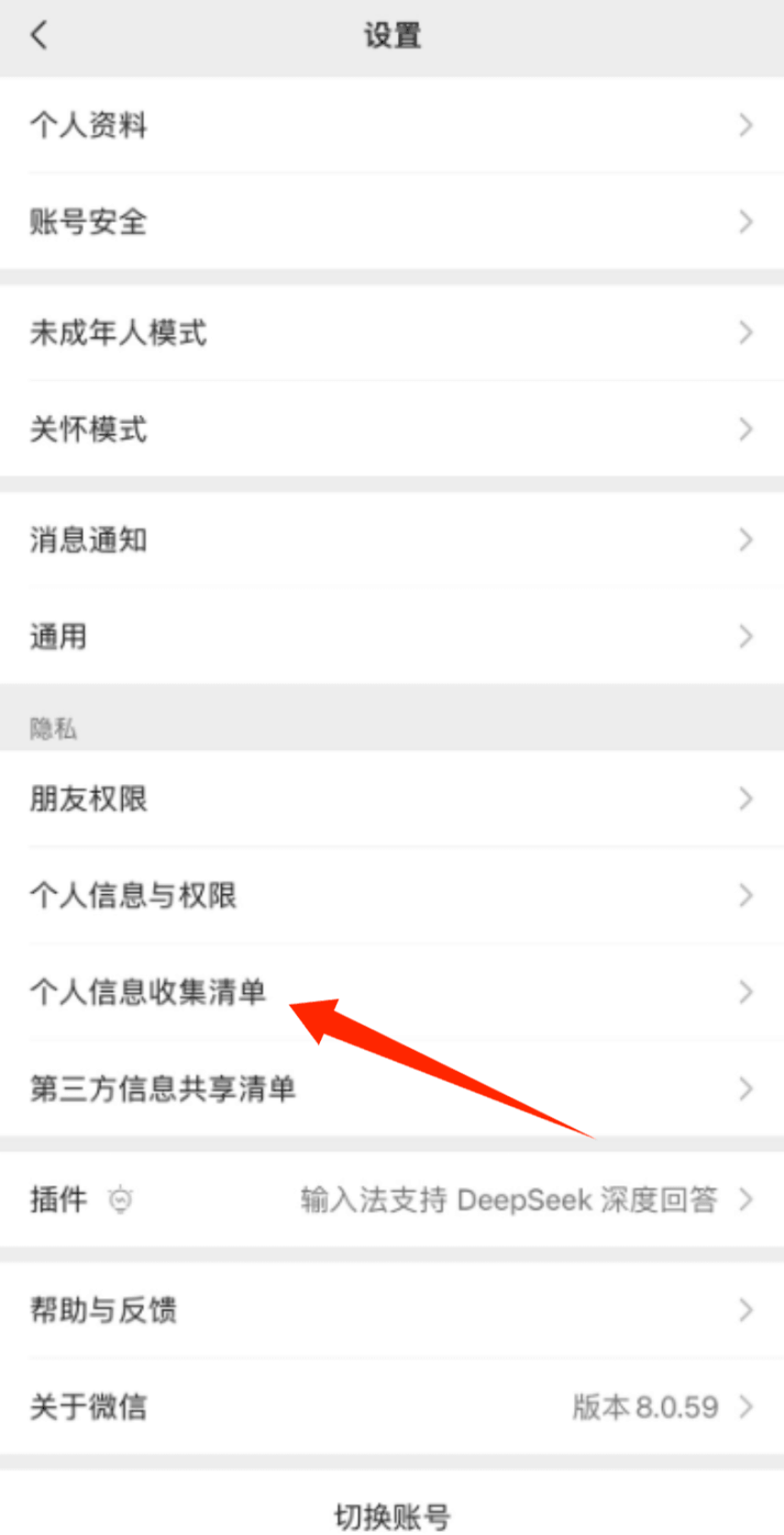 1、进入微信设置页面后,滑动至底部找到【个人信息收集清单】选项,点击即可查看数据使用情况。