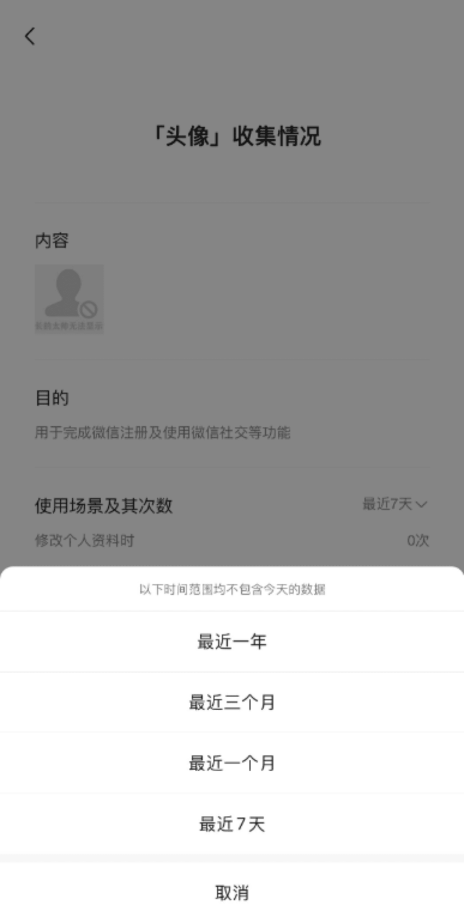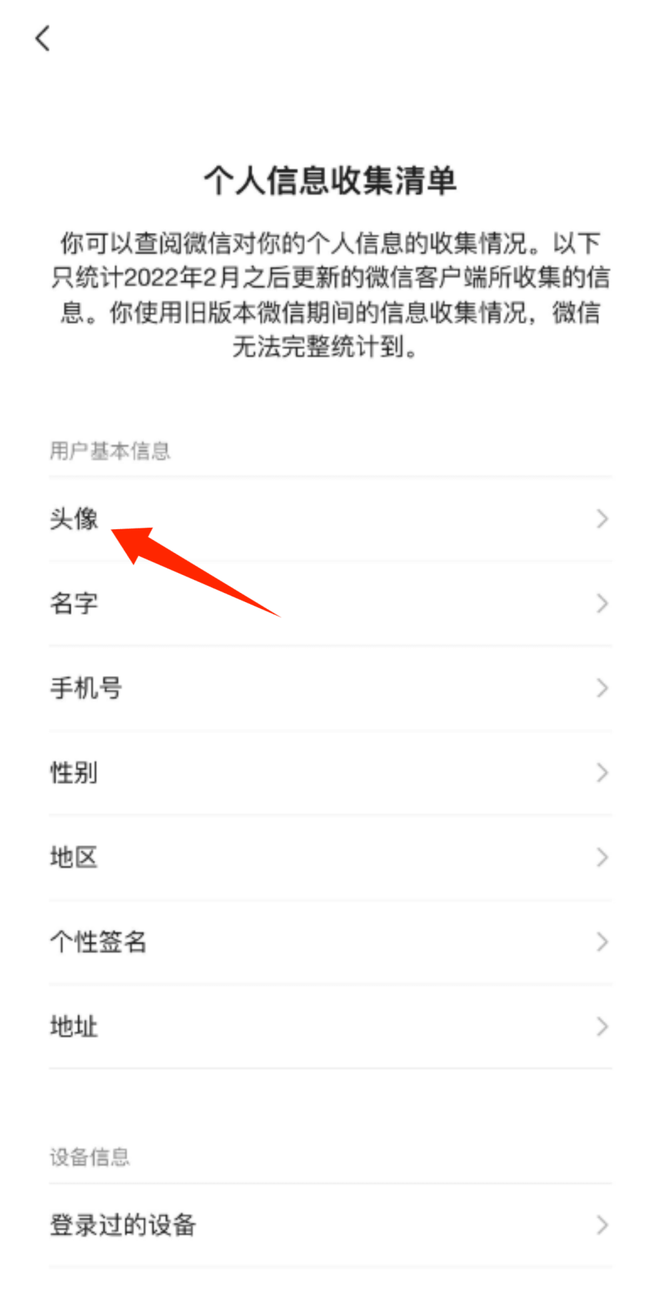 2、选择"头像"项目可查看包括昵称、联系方式、个性签名等在内的完整个人信息收集记录。