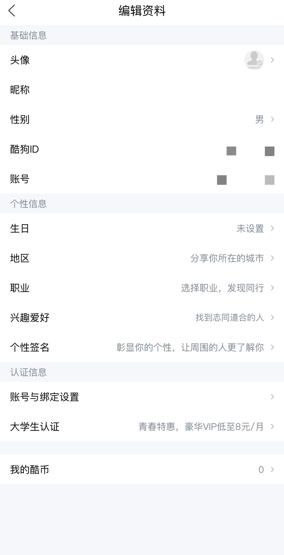 1、打开酷狗音乐APP,先点右下角【我的】进入个人主页,再点击头像进入详细资料页面。