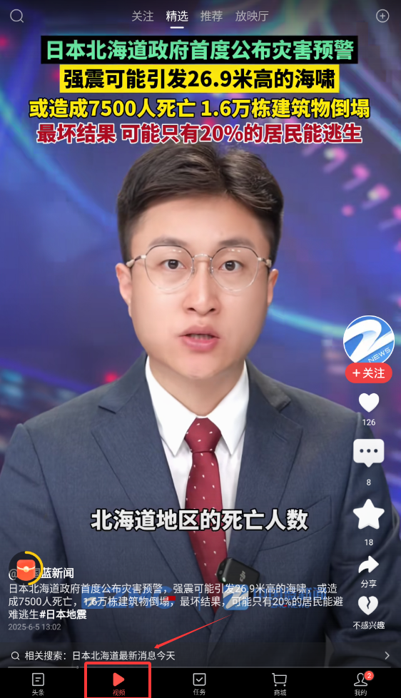 2、今日头条支持类似抖音的上下滑动刷视频模式。进入“视频”频道后,系统会自动播放推荐内容,上下滑动屏幕可切换视频。