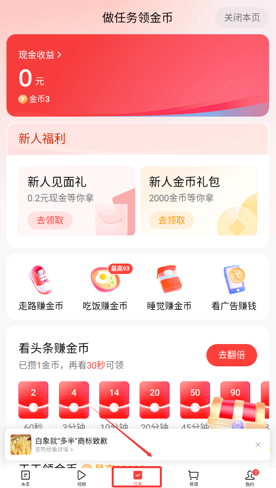 1、点击底部菜单栏的任务图标通常显示为金币或红包样式,进入任务中心后,即可看到各类可完成的任务,如阅读新闻、观看视频、签到等。