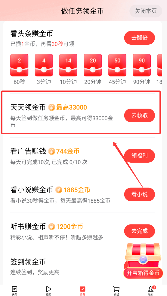 今日头条APP中,点击任务领取金币的步骤如下:打开APP后,点击底部导航栏的“任务”图标,进入任务中心即可看到各类金币任务(如阅读文章、观看视频等)。完成指定任务后,系统会自动发放金币至账户,金币可兑换现金。