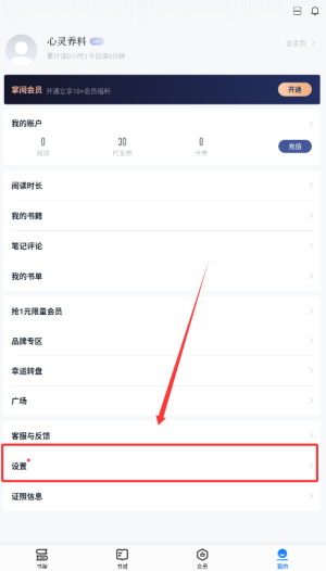 1、打开掌阅APP,选择任意书籍进入阅读界面,点击屏幕中央调出菜单栏,找到右上角的【设置】图标。