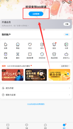 在QQ阅读登录账号的方法如下:首先打开QQ阅读APP,进入首页后点击右下角“我的”选项;在个人中心页面顶部找到“点击登录”按钮,选择“QQ登录”或“微信登录”方式;授权后即可成功绑定账号。若使用手机号登录,需输入号码及验证码完成验证。