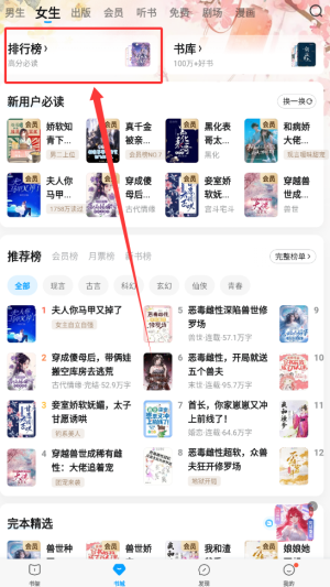 1、首先打开应用并进入“书城”页面,然后在顶部导航栏找到“排行榜”选项并点击进入。