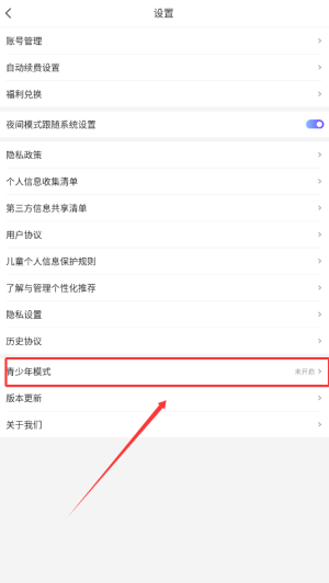 2、点击右上角的设置按钮,在菜单中找到“青少年模式”选项。