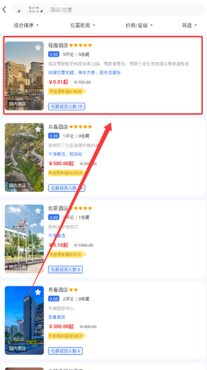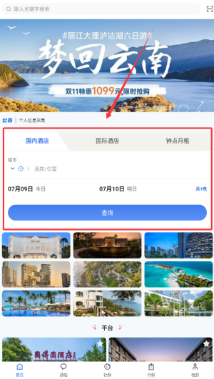 2、进入酒店预订页面输入目的地、日期和人数进行搜索,浏览符合条件的酒店列表后选择喜欢的房型。