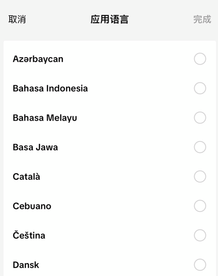 3、进入语言菜单列表,然后滑动找到自己想要的语言,然后点击右上角的完成。