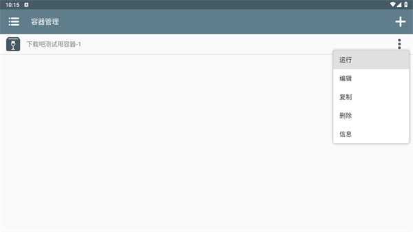 3、完成创建后,点击容器右侧的三点,在弹出的菜单中点击运行;