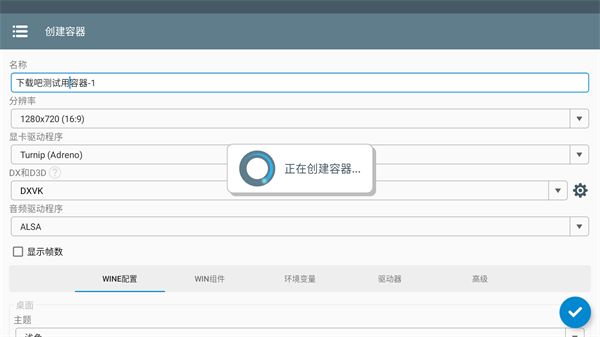 2、在创建容器界面,根据手机的实际情况选择相应的分辨率以及显存大小,如果手机配置较低建议将对应数值调低;