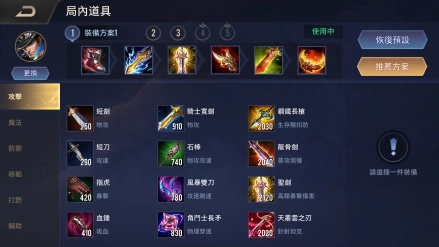 武器装备共有攻击、防御、移动、魔法、打野五大分类区分,玩家需要在对局中消耗金币进行购买;