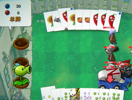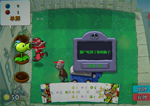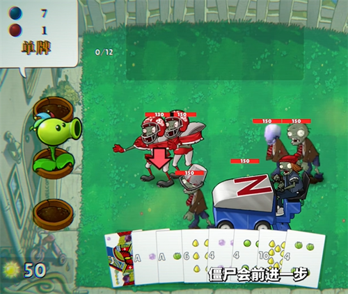 1、游戏以出牌的方式与僵尸进行战斗,玩家每次出牌僵尸都会向前进一步;