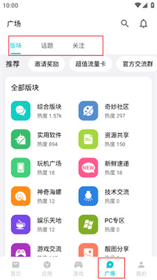 1、打开软件进入【广场模块】可以看到有多重板块可参与交流。
