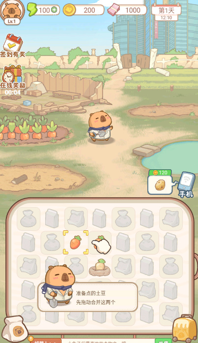 2、正式开始游戏挑战,先开垦荒地然后种植农作物,利用农作物产出然后解锁底部的空槽。