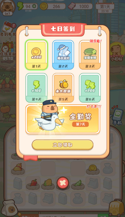 4、登录游戏可以解锁七日签到,每天登录都能直接领取道具奖励。