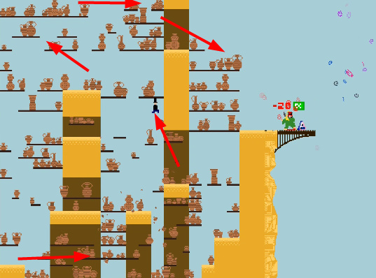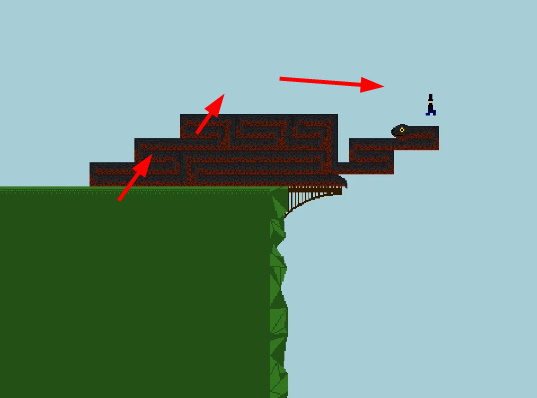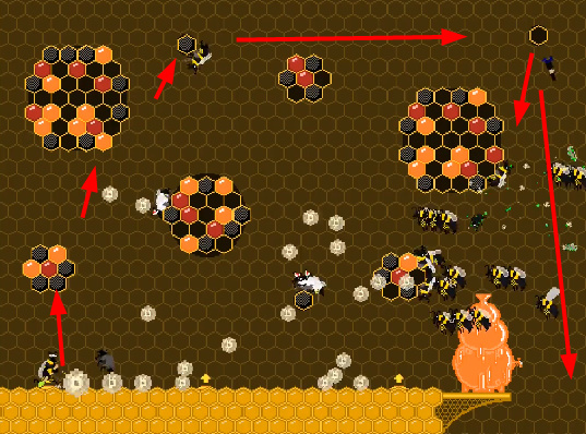 3、第三个场景最有难度,根据箭头来达到最右上角,然后攻击蜂巢将蜜蜂驱散,最后跳下即可。
