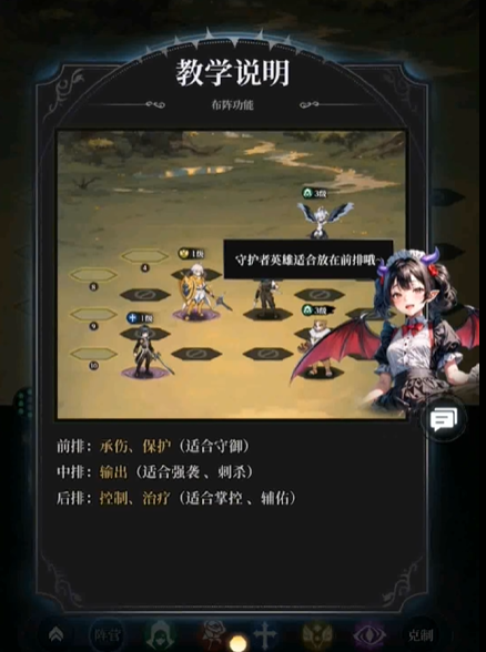 1、游戏中角色根据站位不同分为前排、中排以及后排三个位置,分别负责防守、攻击以及辅助;