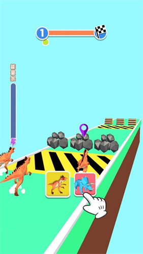 2、恐龙在进行跑酷的过程中会出现不同的障碍以及机关,玩家需要根据对应的地形选择恐龙以更轻松处理;