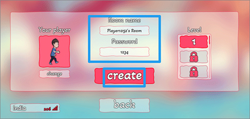 3、如果要创建自己的房间,玩家可以对房间名进行命名,同时可以设置密码,玩家哈可以对自己的角色形象进行调整,随后点击create即可创建;